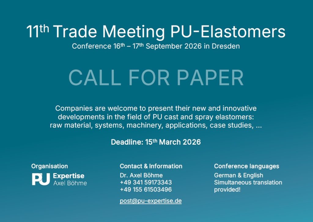 11th PU Elastomer Conference 2026 Feb 18, 2026 | Events | 0 comments Submit a Comment Cancel replyYou must be logged in to post a comment.