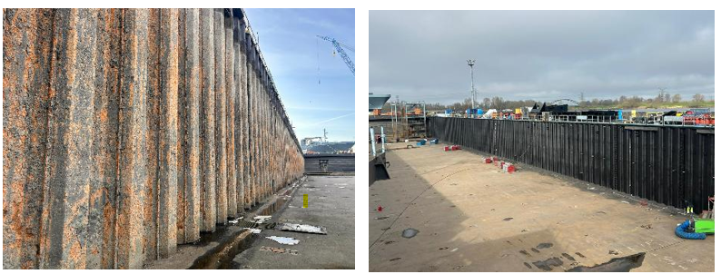 Before and after: Steelpaint’s Stelpant system was applied to the drydock’s sheet piles after existing coatings and steel was blasted to Sa 2½.
